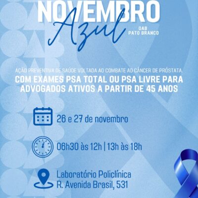 A OAB/PR Subseção de Pato Branco, em parceria com a Caixa de Assistência dos Advogados, convida todos os Advogados ativos, a partir de 45 anos, para participarem da ação preventiva de saúde voltada ao combate ao Câncer de Próstata. 🧬 Exame disponível: PSA Total ou PSA Livre Para a realização...