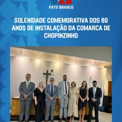No dia 04 de dezembro, o Presidente da OAB/PR Subseção de Pato Branco, Dr. Luiz Fernando de Oliveira Viana Filho, esteve presente na Solenidade Comemorativa dos 60 anos de instalação da Comarca de Chopinzinho. O evento reuniu diversas autoridades locais, membros do Judiciário, representantes da advocacia e convidados em um...