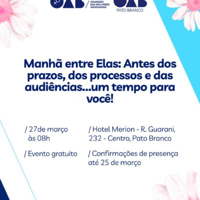 A Comissão das Mulheres Advogadas da OAB/PR Subseção de Pato Branco convida você para um encontro especial: antes dos prazos, dos processos e das audiências… um tempo para você. Um momento intimista, pensado especialmente para mulheres advogadas, com o propósito de proporcionar uma pausa na rotina, fortalecer conexões e promover...