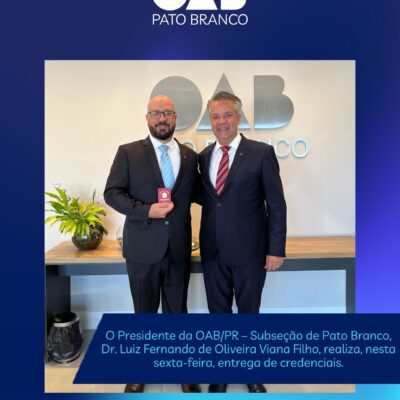 O Presidente da OAB/PR – Subseção de Pato Branco, Dr. Luiz Fernando de Oliveira Viana Filho, realiza, nesta sexta-feira, entrega de credenciais.