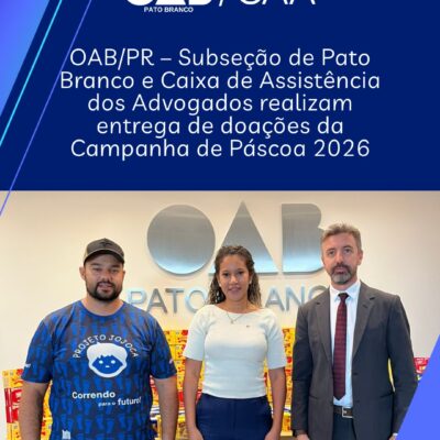 Vamos juntos tornar a Páscoa mais doce para quem mais precisa! A CAA/PR, em parceria com a OAB/PR – Subseção de Pato Branco, está promovendo a Páscoa Solidária 2026, uma campanha de arrecadação de caixas de bombom (Nestlé, Garoto ou Lacta) que serão destinadas às crianças atendidas pelo Projeto Jojocas....
