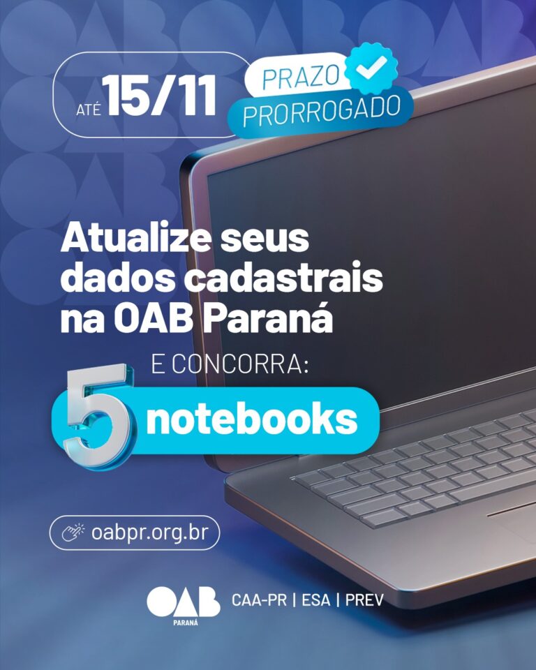 Você tem mais uma chance de concorrer aos 5 notebooks de última geração que a OAB-PR vai sortear entre advogados/as que atualizarem o cadastro! 💻🤩 Atualize até 15 de novembro e participe❗