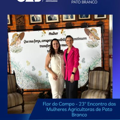 No dia 05 de março, a Presidente da Comissão das Mulheres Advogadas, Dra. Ana Lúcia Garcia Mendes, e a Presidente da Comissão de Direito Público/Advocacia Pública, Dra. Ana Paula Freitag Carneiro, estiveram presentes no evento Flor do Campo – 23º Encontro das Mulheres Agricultoras de Pato Branco, representando a OAB/PR...