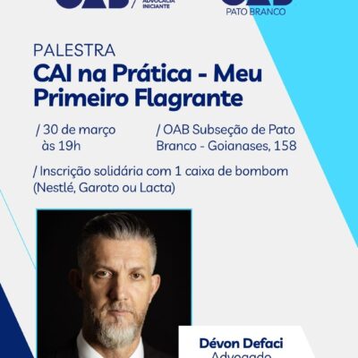 A Comissão da Advocacia Iniciante da OAB/PR – Subseção de Pato Branco convida advogados e advogadas iniciantes, bem como estudantes de Direito, no dia 30 de março, às 19h, será realizada a palestra “CAI na Prática – Meu Primeiro Flagrante”, ministrada pelo advogado criminalista Dr. Dévon Defaci, que compartilhará orientações...
