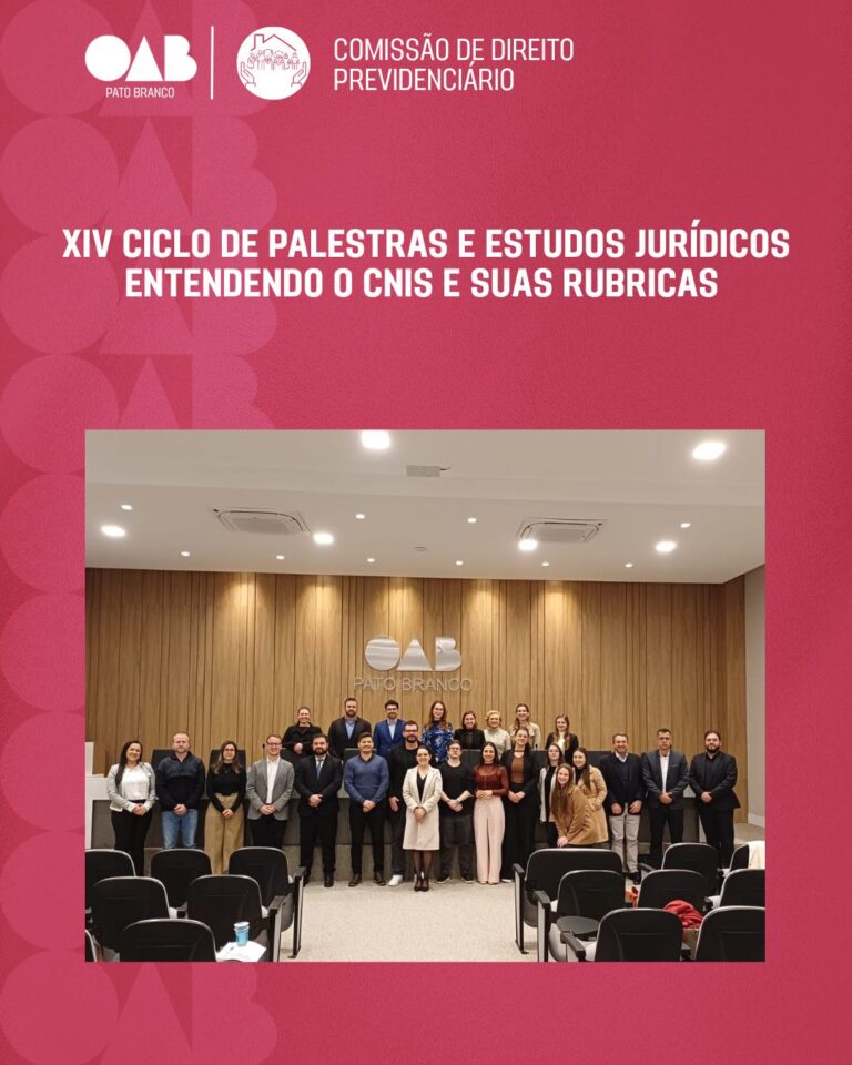 No dia 27 de agosto de 2025, a OAB/PR – Subseção de Pato Branco, por meio da Comissão de Direito Previdenciário, realizou a palestra presencial “Entendendo o CNIS e suas Rubricas”, integrando a programação do XIV Ciclo de Palestras e Estudos Jurídicos.